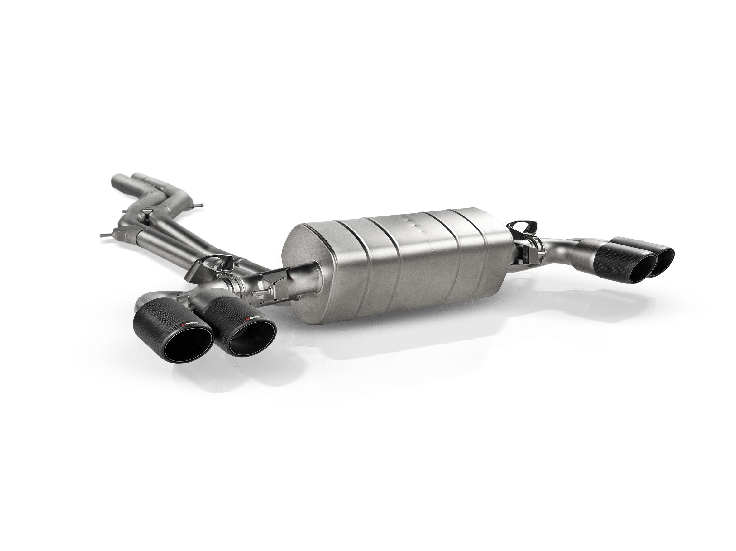 This product is crafted from high-grade, lightweight titanium for a weight reduction of 45% (14.5 kg) compared to the sport stock exhaust. This exhaust system features a central muffler with valves on both sides ‒ with valve housings cast in-house ‒ to regulate the gas flow before it exits through two pairs of attractive double round handmade carbon-fiber tailpipes that contain acoustic reflectors to deliver enhanced sound to the passenger cabin. A comfortable sound with a pleasant V8 back track is emitted at cruising speed, which becomes sportier when driven more dynamically and through the use of the car’s mode selectors. When tested on the Akrapovič dyno against a Porsche Cayenne Turbo E-Hybrid with a stock sport exhaust system, it achieved a power gain of 4.0 kW (5.4 hp) at 2,100 rpm and a torque increase of 18.6 Nm at 2,050 rpm. This product has plug-and-play installation and no need for remapping.