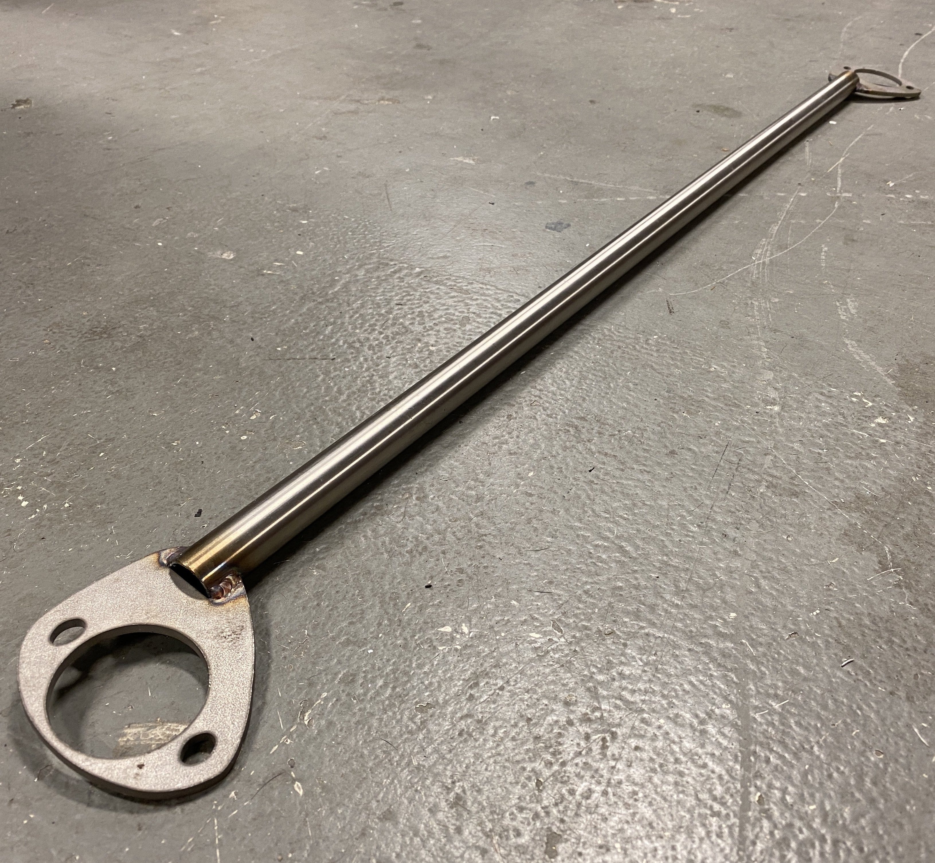 Condor stainless steel E30 rear strut bar. Triangulate your rear shock mounts with our lightweight strut brace to make your rear suspension more predictable. Tig welded from stainless steel, the bar ends double as rear shock mount reinforcement plates.