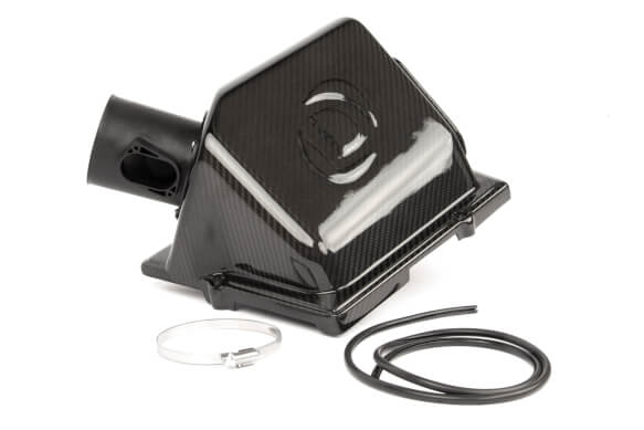 With more air being pulled into the system, throttle response is improved and additional power is realized in the form of max gains of +5 HP / +5 ft-lbs of torque. The secondary air inlet also allows the intake system to be more audible so the turbo spool and BOV can be appreciated. A stark difference from Dinan's traditional fully sealed systems where induction noise is not nearly as recognizable. Not to be outdone by the increased power and sound, the system is made of immaculate carbon fiber so it looks the role as well. The end result of an optimized lid, an improved filter, and thorough testing, yields an incredibly efficient and cost-effective solution that you will be hard-pressed to beat.