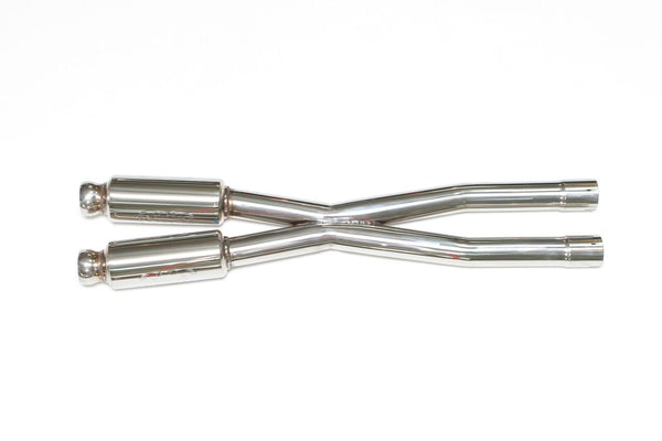 Replaces the restrictive and redundant factory secondary with a free-flowing x-pipe section which increases power and sound; available with or without resonators for additional weight savings.
