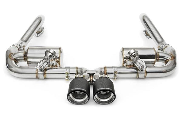 FINISH: Full polished T304L stainless steel, beautifully welded together and finished off with premium carbon fiber shrouded tips which fit the rear bumper of the Cayman / Boxster like a finely tailored suit.