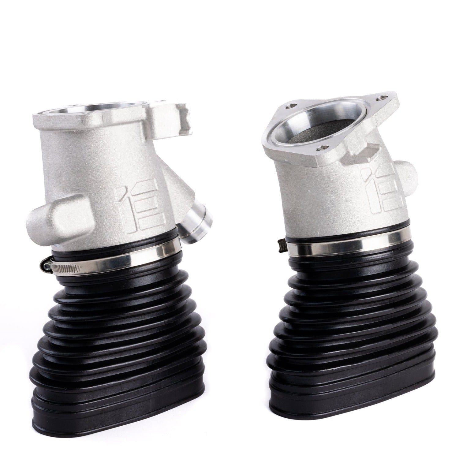 To accomplish the unique shapes and bends necessary for maximum airflow, iE turbo inlets are manufactured from aircraft-grade aluminum castings. This process yields an attractive finish and an incredibly durable product that retains all factory connections and mounts for a seamless install.