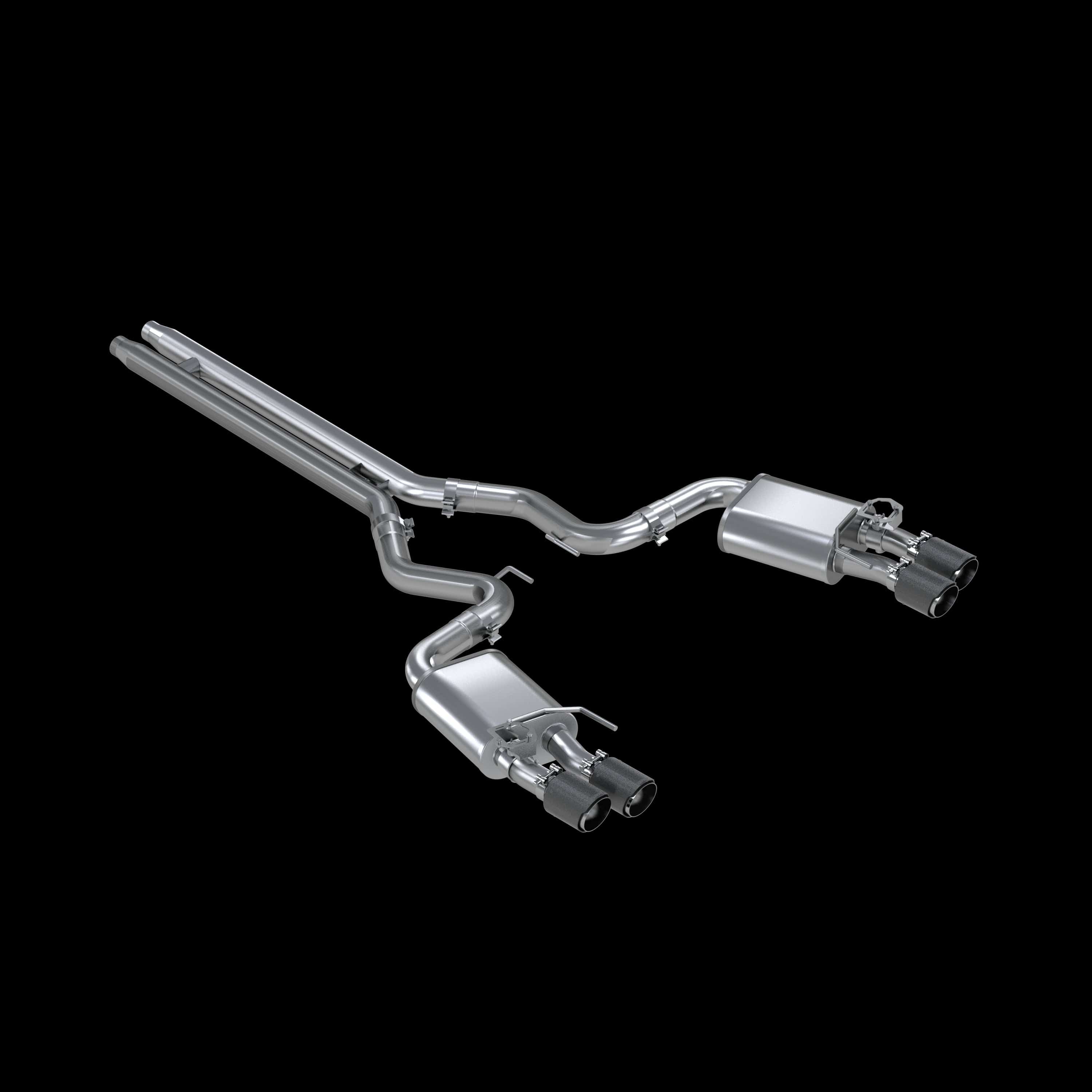 This MBRP(R) dual quad rear exit performance exhaust design on the Ford Mustang GT 5.0L with its innovative design including 3" Mandrel-bent tubing allows for a +35% increased in flow over stock in track mode. This aftermarket exhaust system is carefully engineered to stay true to the Ford Mustang Active design which has 4 modes for Active exhaust. The 4 modes are Quiet, Normal, Sport and Track and the MBRP Active exhaust makes an incredible difference in both design and sound. The exhaust system is equipped with straight-through sound absorption mufflers and a Helmholtz Resonator that keeps the Drone l ­evel minimal for perfect highway driving conditions. We love the Ford Mustang OEM Active system. Quiet mode start up definitely keeps the neighbours happy for those early morning engine starts. Knowing that Sport Mode or Track mode is available with the Mustang Active exhaust, it takes your driving experience to a new level at the track or simply cruising the streets. The MBRP(R) Ford Mustang Active exhaust system uses larger piping compared to the factory exhaust system with 3" O.D. mandrel-bends T304 stainless steel piping which includes a Limited Lifetime warranty. At MBRP we stand behind the quality of work with excellent craftmanship and welding by MBRP welders. The Ford Mustang GT exhaust tips come in T304 stainless steel with a Carbon Fiber shell and MBRP logo centered on top for each tip. This is really the cherry on top for this Cat-back Dual Quad Split rear exit performance exhaust system and blends in with rear bumper perfectly. Ford(R) and Mustang enthusiasts should consider this exhaust system based on quality and overall sound upgrade that matches the race design of the Ford Mustang GT.