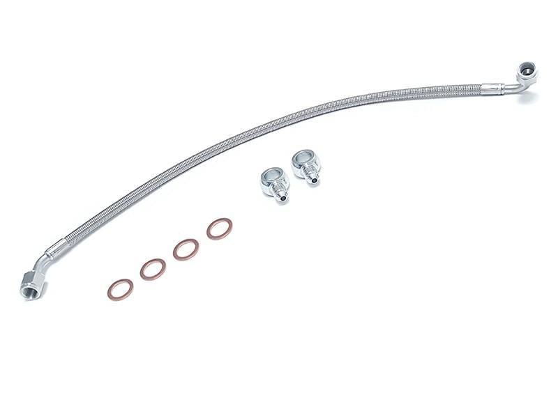 NM Eng Turbo Oil Line features stainless steel braided line with properly clocked banjo ends. This oil line fixes the very common oil leak coming from the factory hard line. A must 'while-you're-at it' upgrade every time you remove the bumper to access the turbo, replace water pump housing, or upgrading your intercooler. Unaddressed turbo line leak can cause a huge mess, starvation to the turbo, and even fire when the oil drips onto the catalytic converter (hottest part on the entire car).
