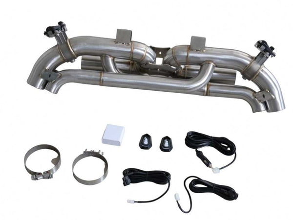 - Supplied electronic valves allow straight-through design for maximum power and sound. Less back pressure improves turbo response and improves horsepower and torque significantly.