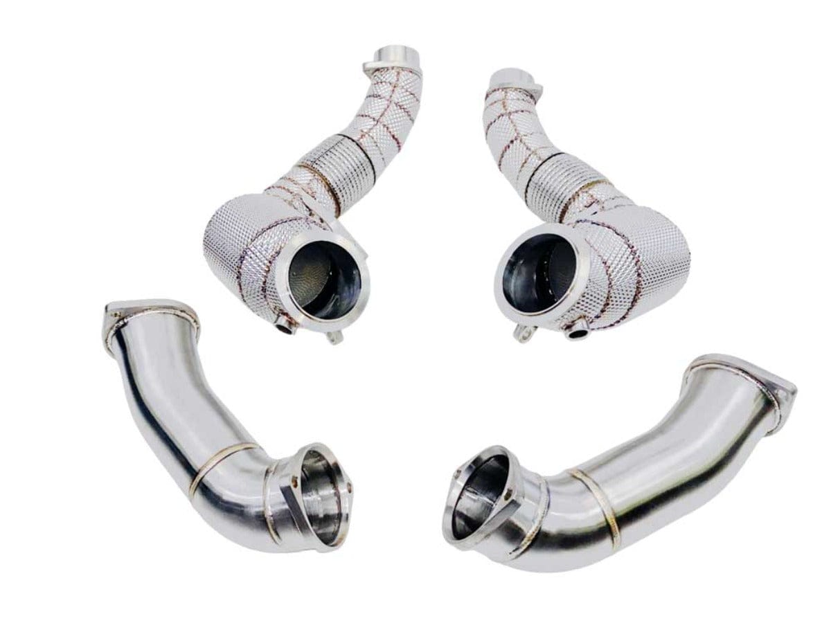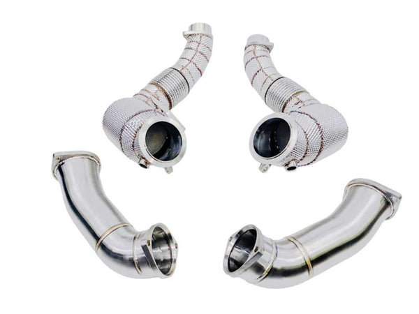 Our new Gen2 Racing Dynamics Catted sport downpipes w/HS for BMW M5 (F90), M8 (F91/F92/F93), X5M (F95) and BMW X6M (F96) 2022+ models with V8 twin turbo S63B44T2 motor. Our Gen2 Downpipes include improvements in flex joint to reduce vibration and allow alignment during installation, O2 sensor bungs for reinstallation of the OE O2 oxygen sensors, and mounting brackets to support the weight. Down-pipes by there very nature reduce restrictions of the catalytic converters allowing your turbos to breath more efficiently. This reduced restriction allows the turbos to spool up more quickly and provide a more aggressive turbo sound. This is a complete 4 pipe system.