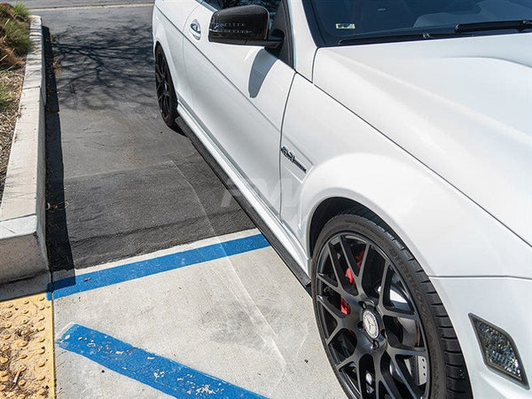 Complete your carbon fiber aero package on your Mercedes W204 C63 AMG with a set of our carbon fiber side skirt extensions. These side skirt extensions bolt on to your existing C63 side skirts to add an aggressive new side profile to your 2008-2014 Mercedes C63 AMG. Every one is meticulously quality checked and then clear coated to ensure a beautiful show-like shine and great protection against road debris and the sun's harmful UV rays. If you have a carbon fiber lip or diffuser on your W204 C63 then these carbon fiber c63 side skirt extensions are a must! The CF extensions feature bolt on installation that requires no special parts or modifications to your C63. Be the first in your city to rock these new Mercedes W204 C63 CF side skirt extensions!