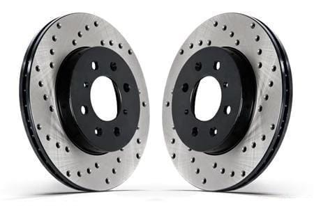 Stoptech Cross-Drilled rotors are 1-piece, drilled, direct replacement discs for your factory brake system and stock calipers. They offer improved cooling as well as other advantages the competition doesn't offer. Innovations include e-coating, double-disc grinding, full machining, mill balancing and center-split castings, as well as the availability of directional vanes, cryogenic treatment and the use of Power Alloy. Today, Stoptech Cross-Drilled covers more than 2500 applications, all machined in Stoptech Cross-Drilled California manufacturing center. Every Stoptech Cross-Drilled rotor is a direct replacement for a factory brake rotor, allowing the retention of factory calipers in the system.