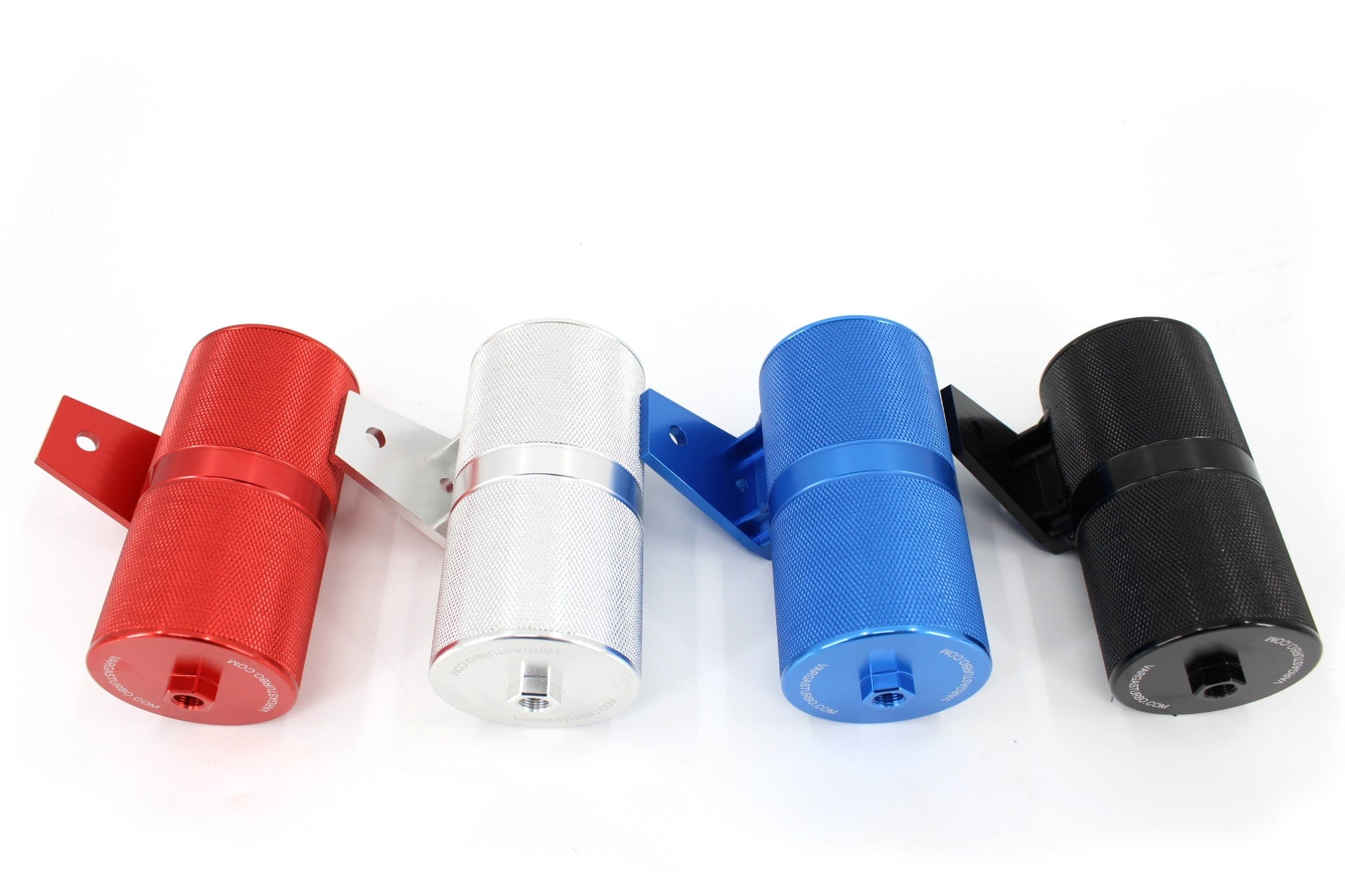 VTT is proud to offer our billet replacement for the factory plastic vacuum tanks that store vacuum from the pump and use it to regulate boost via the solenoids. The stock plastic can, and small plastic nipples on the stock cans have a tendency to crank over time, and if they leak you will get low boost, or no boost, and poor performance. These cans do away with the weak plastic cans while adding some pop, and color to your engine bay. These vacuum cans retain ALL of the factory provisions including mounting points but come with 90-degree fittings for easier routing of the lines