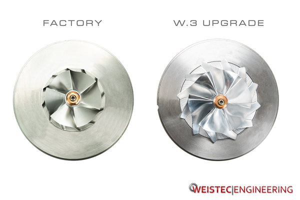 The factory turbocharger is disassembled and fully inspected. The compressor cover and center cartridge are then machined to accept our 5-axis CNC machined larger impeller wheel. Externally, no changes are made to maintain a completely stock appearance. The new impeller wheel supports greater power levels than the factory unit with little to no sacrifice in spool and response. The turbochargers are then reassembled with new seals and fully balanced for smooth operation and OEM service life. All the original oil and coolant lines bolt right up making for a simple install. Custom tuning and proper supporting upgrades required for best results and performance.