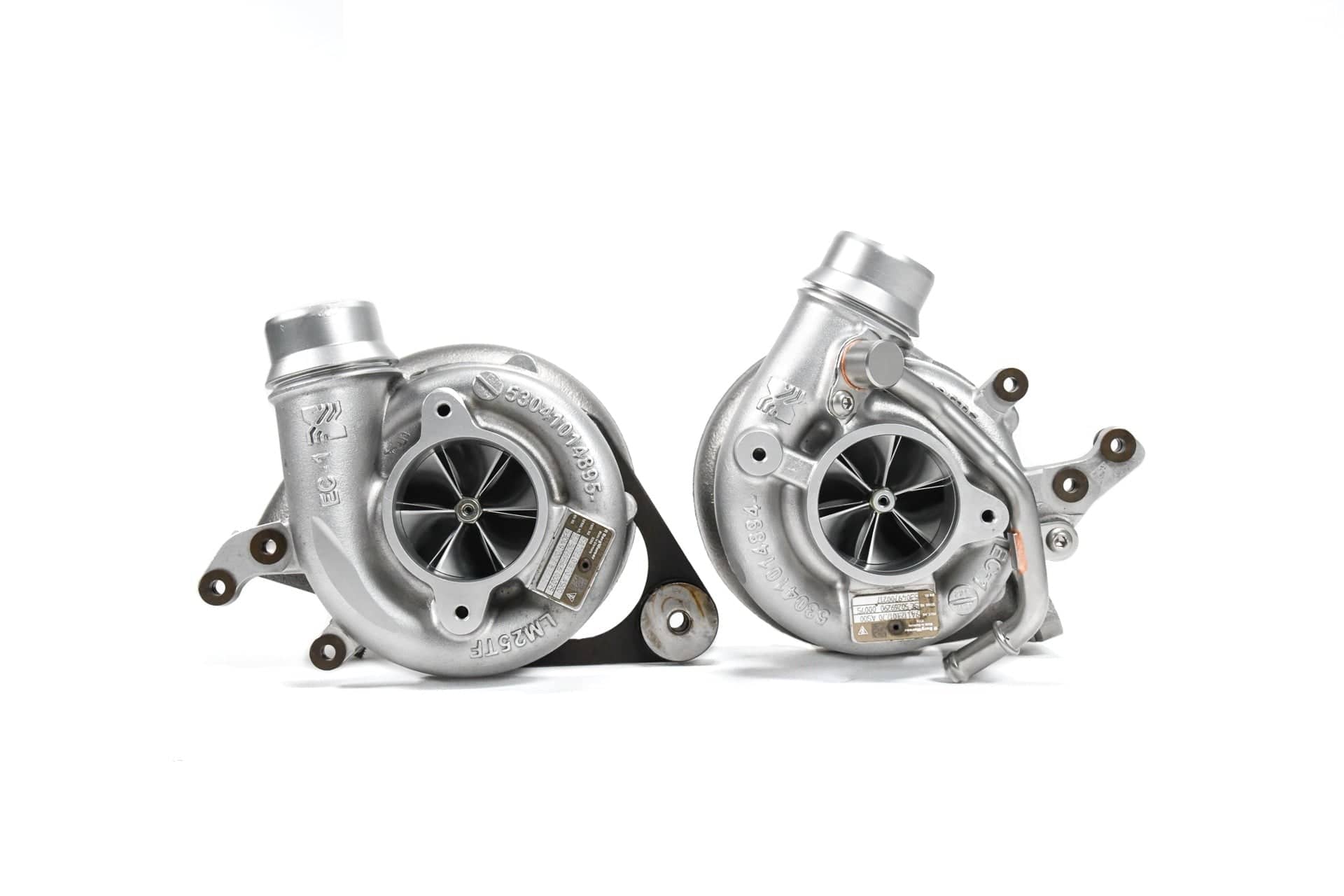 The factory turbocharges are disassembled and fully inspected. The compressor cover and center cartridge are then machined to accept our 5-axis CNC machined impeller wheel which despite being substantially larger, weighs the same as the factory cast impeller wheel. Externally, no changes are made to maintain a completely stock appearance. The new impeller wheel supports greater power levels than the factory unit with little to no sacrifice in spool and response thanks to its light weight construction. The turbochargers are then reassembled with new seals and bearings, then fully balanced for smooth operation and OEM service life. All the OEM oil and coolant lines bolt right up making for a simple install.